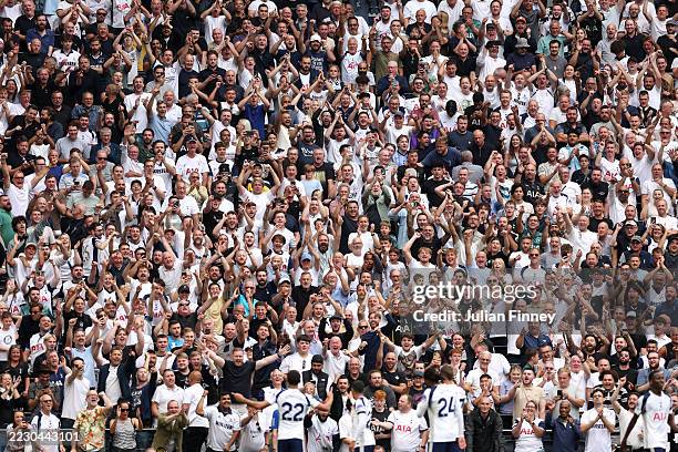 LONDON, ENGLAND – AUGUST 16: Fans of Tottenham Hotspur celebrate in the stadium during the Premier League match between Tottenham Hotspur and Burnley at Tottenham Hotspur Stadium on August 16, 2025 in London, England. (Photo by Julian Finney/Getty Images)